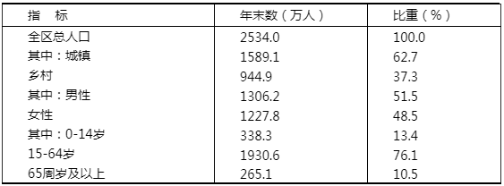 年末全区常住人口2534.0万人,比上年增加5.4万人。其中,城镇人口1589.1万人,乡村人口944.9万人;常住人口城镇化率达62.7%,比上年提高0.7个百分点。男性人口1306.2万人,女性人口1227.8万人。全年出生人口21.1万人,出生率为8.35‰;死亡人口15.1万人,死亡率为5.95‰;人口自然增长率为2.40‰。