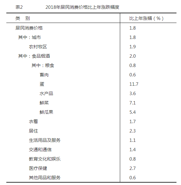 全年居民消费价格比上年上涨1.8%。分城乡看,城市上涨1.8%,农村牧区上涨1.9%。分类别看,八大类价格均呈上涨态势。食品烟酒类价格上涨2.0%,衣着类上涨1.7%,居住类上涨2.3%,生活用品及服务类上涨1.1%,交通和通信类上涨1.4%,教育文化和娱乐类上涨0.8%,医疗保健类上涨2.7%,其他用品和服务类上涨0.6%。从工业生产者角度看,工业生产者出厂价格和购进价格分别上涨3.2%和2.4%。固定资产投资价格上涨3.6%,农产品生产者价格上涨2.0%。