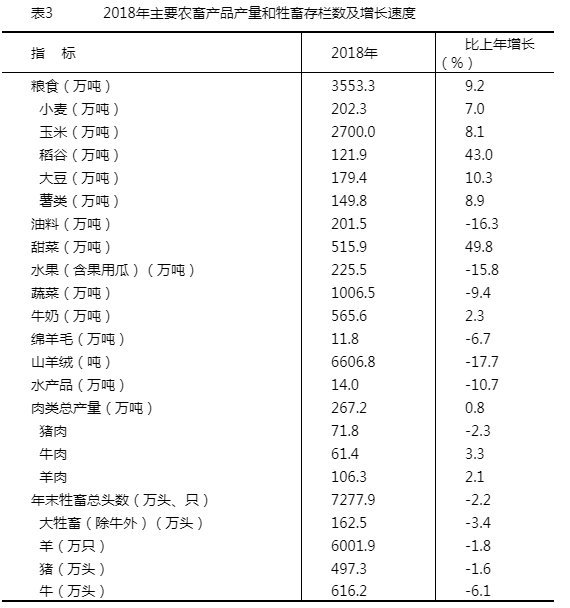 全年农作物总播种面积798.3万公顷,比上年增长0.8%。其中,粮食作物播种面积575.8万公顷,下降0.5%;经济作物播种面积222.5万公顷,增长4.1%。粮食总产量达2768.4万吨,比上年下降0.4%;油料产量222.7万吨,增长1.2%;甜菜产量363.0万吨,增长36.4%;蔬菜产量1364.6万吨,下降9.2%;水果(含果用瓜)产量340.8万吨,增长7.7%。